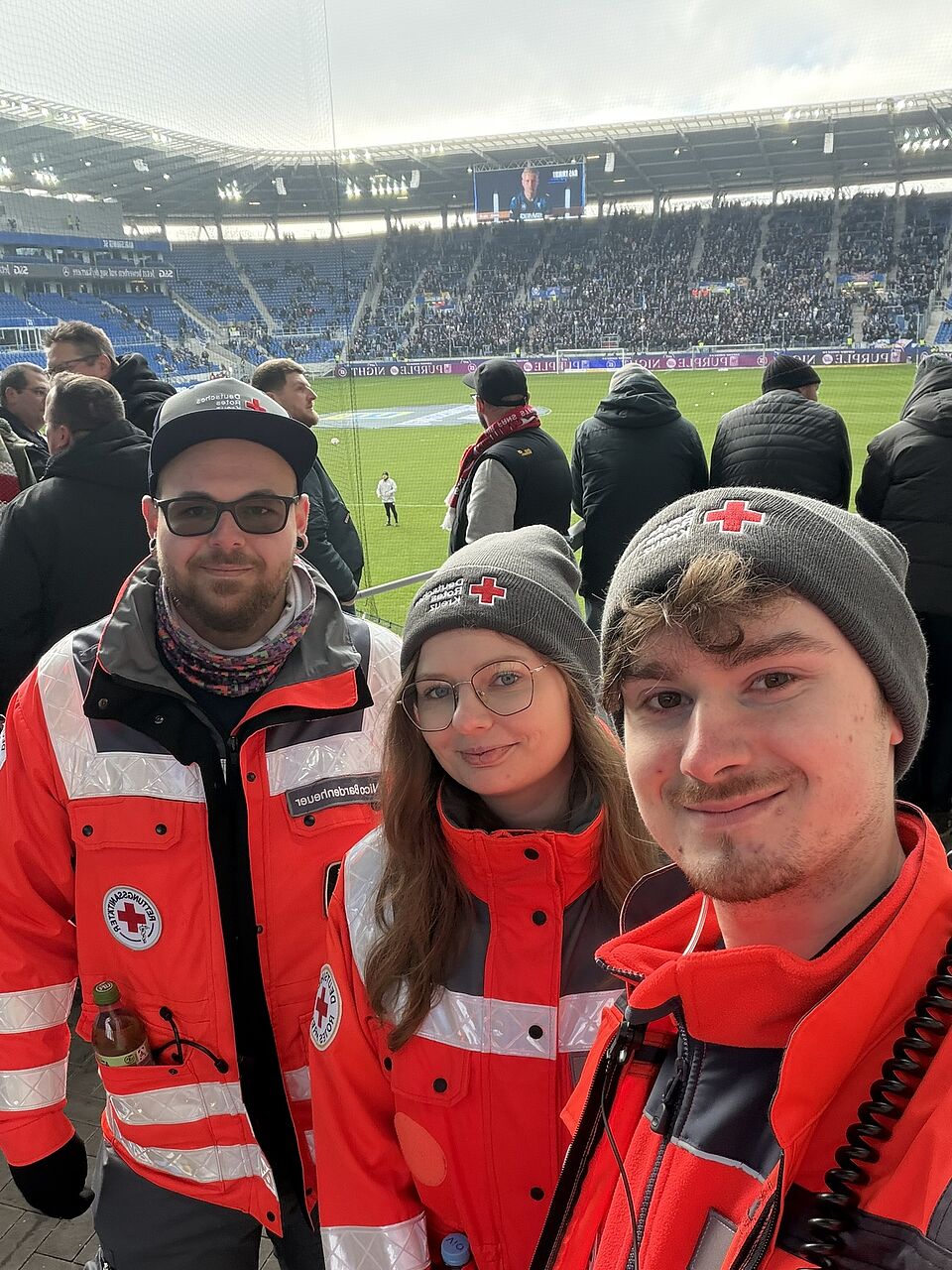 Das Team, bestehend aus unserem Bereitschaftsleiter Nico, Rettungssanitäter Joschua und unserer Praktikantin Jessica, betreute die Fans des Gästeblocks.